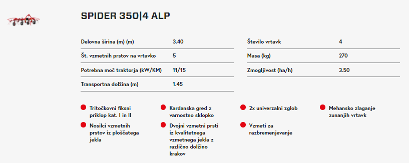 - Vrtavkasti obračalniki SPIDER ALP so namenjeni za delo s traktorji z manjšo močjo na bolj strmih površinah in v nagibu.