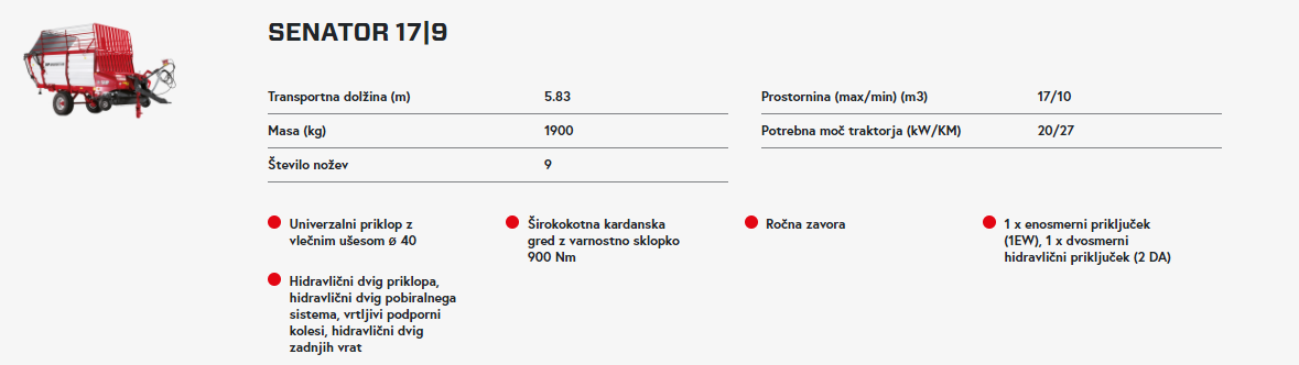 Alpinske NAKLADALNE PRIKOLICE SENATOR zadovoljijo vse potrebe kmetov ali koncesionarjev, ki iščejo visoko produktivnost in kakovost krme. Ob enostavni uporabi zagotavljajo hitro delo in čisto pobiranje krme. Prostornina nakladalnih prikolic je od 17 do 26 m3, zaradi nizkega težišča pa sta upravljanje in prevoz izredno enostavna, tudi pri delu na strmini.